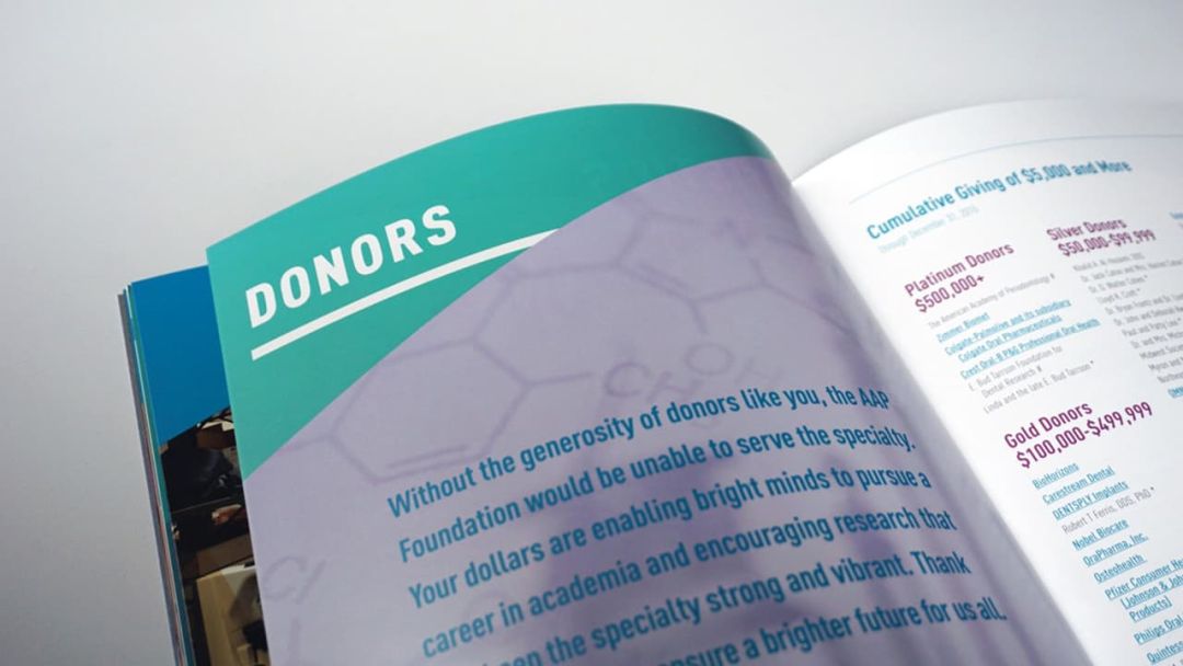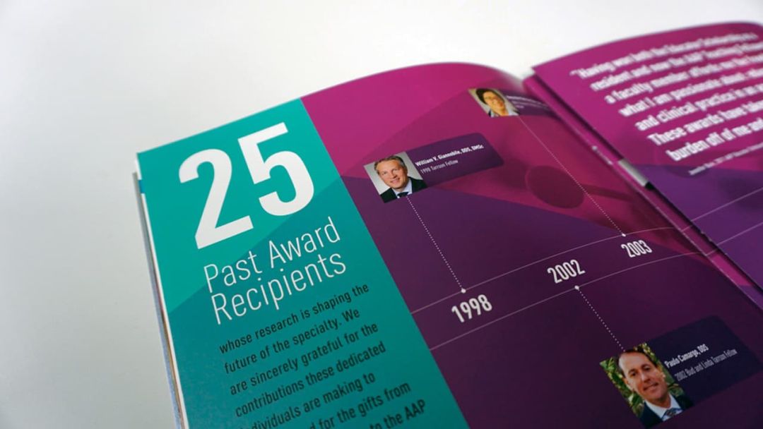 The AAP Foundation wanted to have something extra special for this annual report, as it would commemorate 25 years of innovation. The names of various scholarships and awards were die cut onto a metallic silver cover revealing images of science, periodontology and innovators in the field. A timeline spanning the bottom of each scholarship and award page leads readers through the history of the foundation and its achievements.