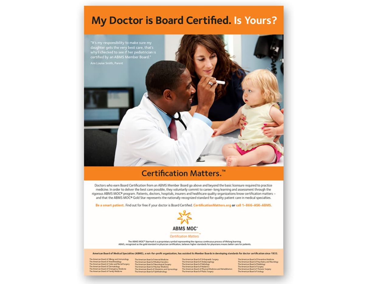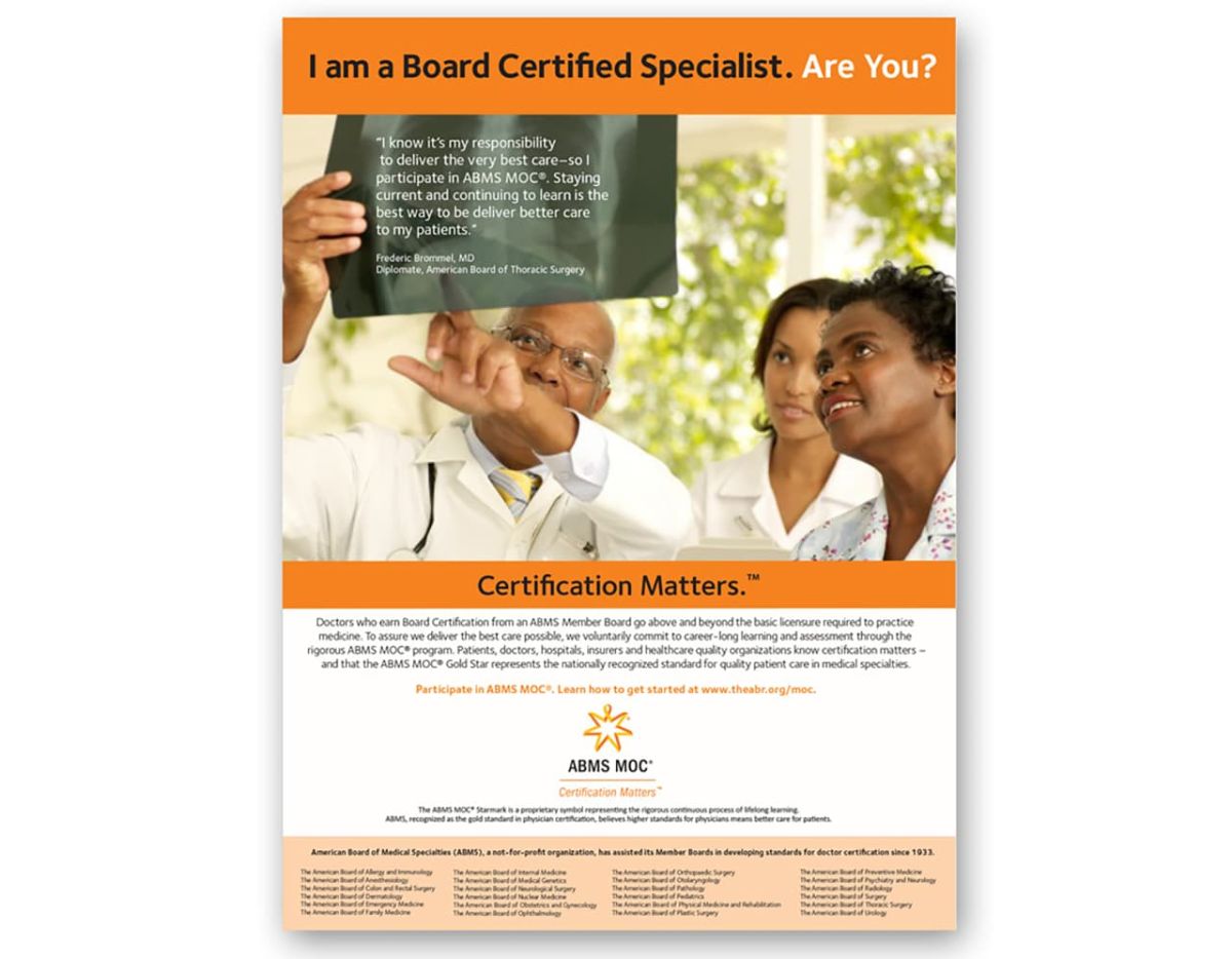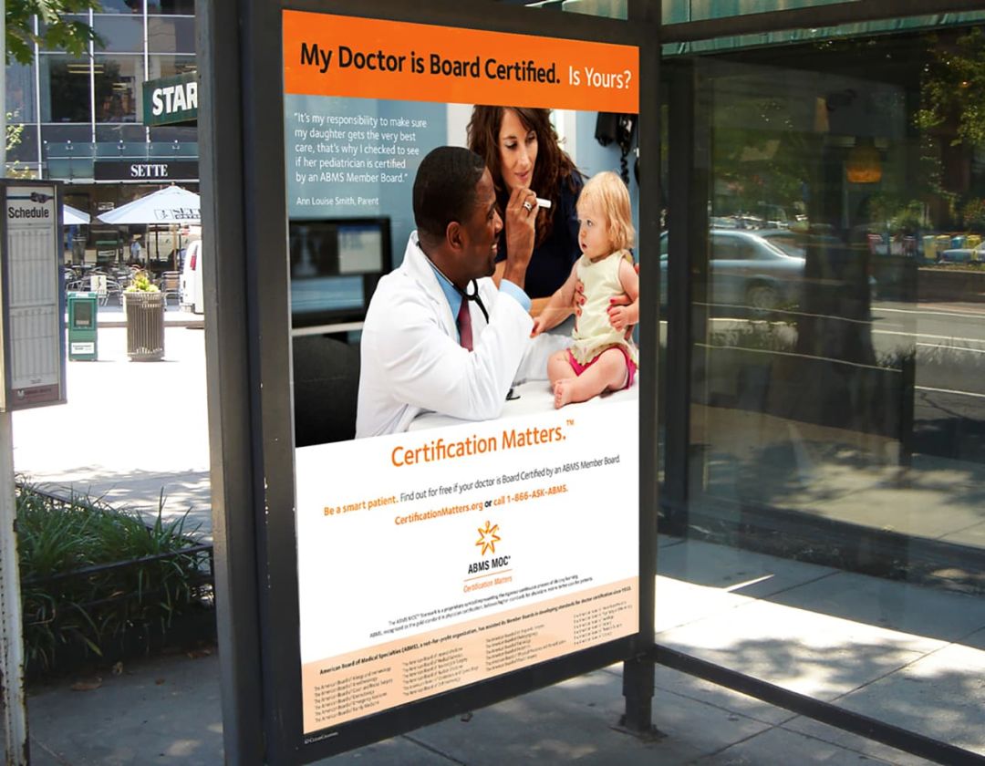In order to drive the public to the public-facing website about the value of ABMS Board Certification and Maintenance of Certification; print ads, web banners, and bus shelters were suggested in this integrated marketing plan. Media buys included Banner Ads in a mix of targeted categories and a Pay Per Click campaign. Analytics demonstrated continuous improvement at well above industry standard averages.