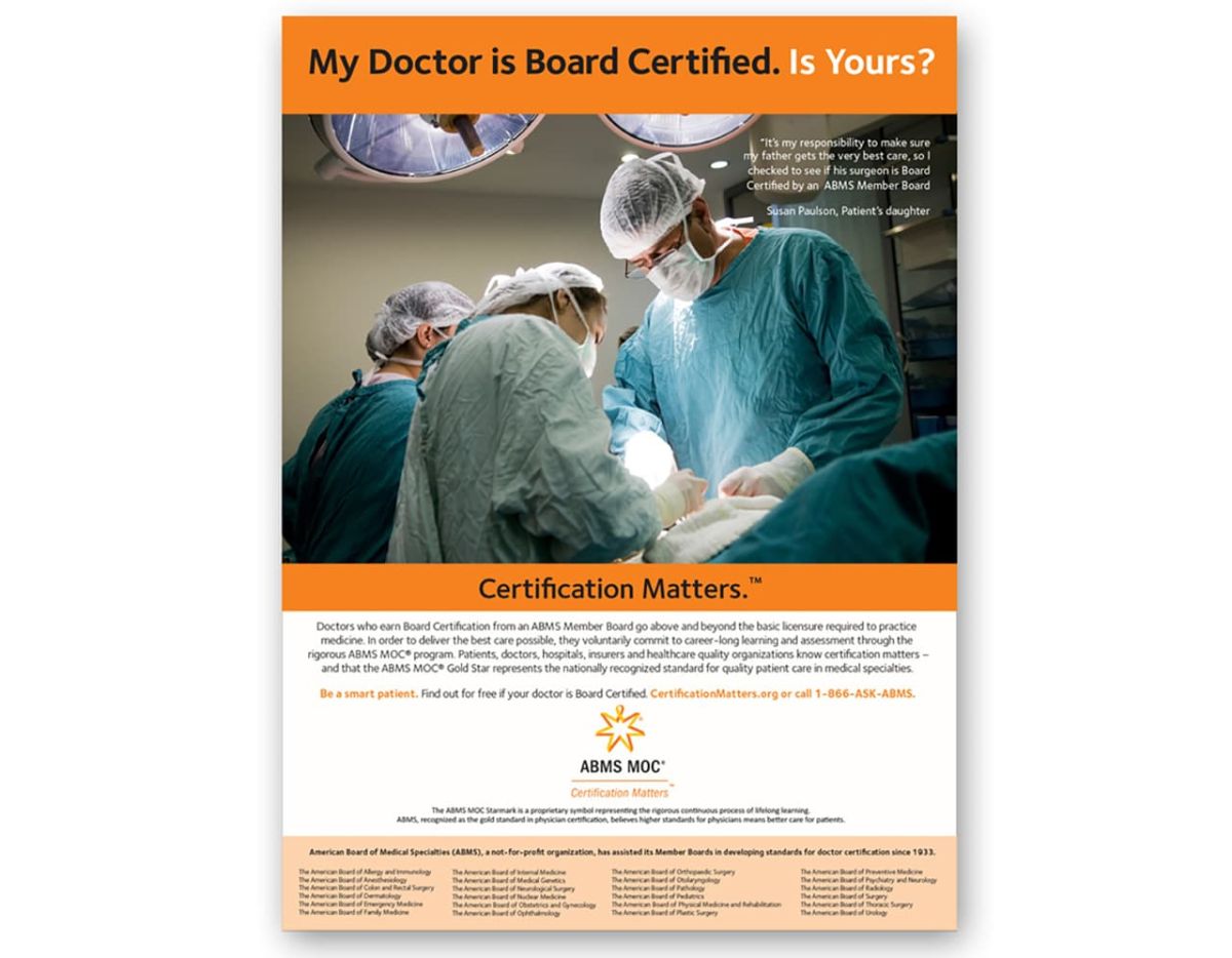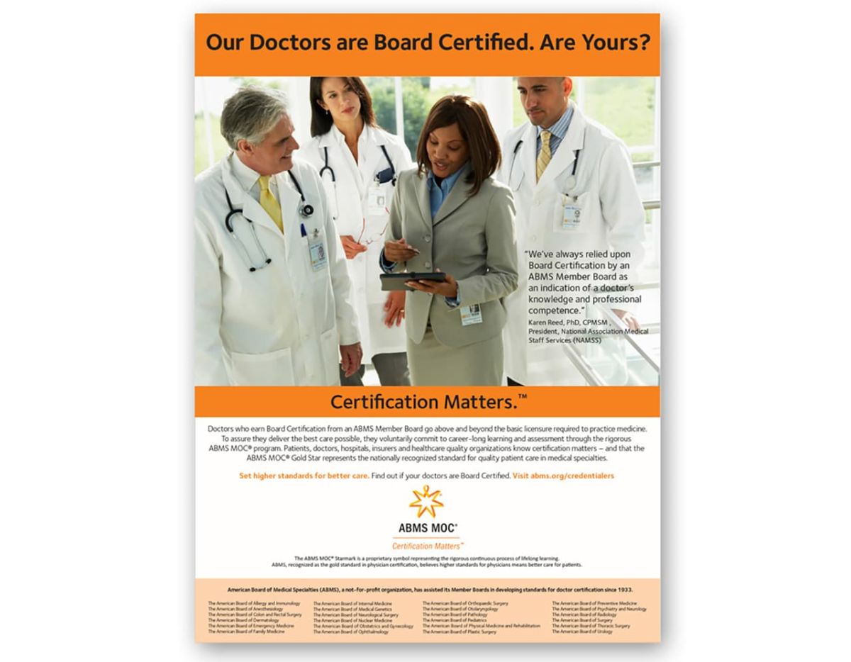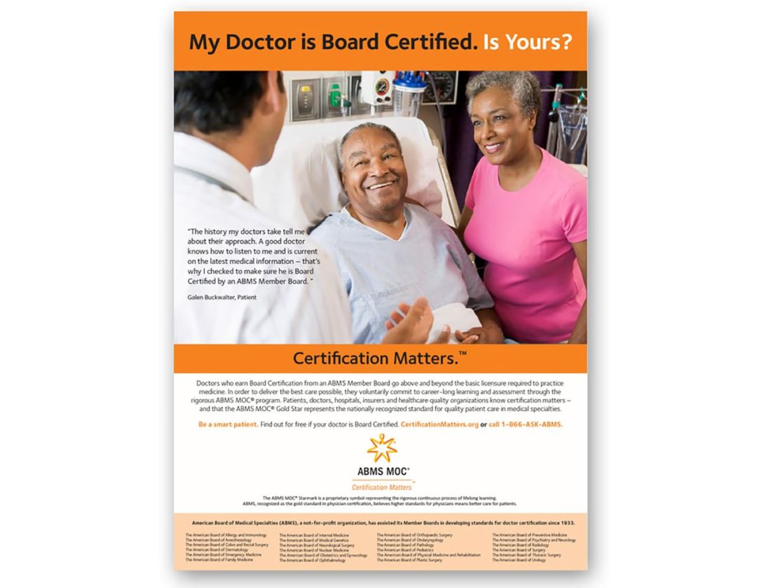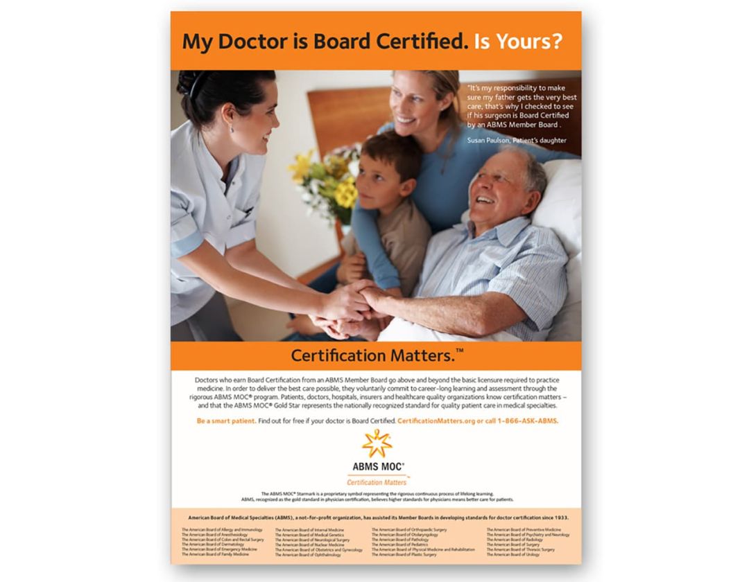 In order to drive the public to the public-facing website about the value of ABMS Board Certification and Maintenance of Certification; print ads, web banners, and bus shelters were suggested in this integrated marketing plan. Media buys included Banner Ads in a mix of targeted categories and a Pay Per Click campaign. Analytics demonstrated continuous improvement at well above industry standard averages.
